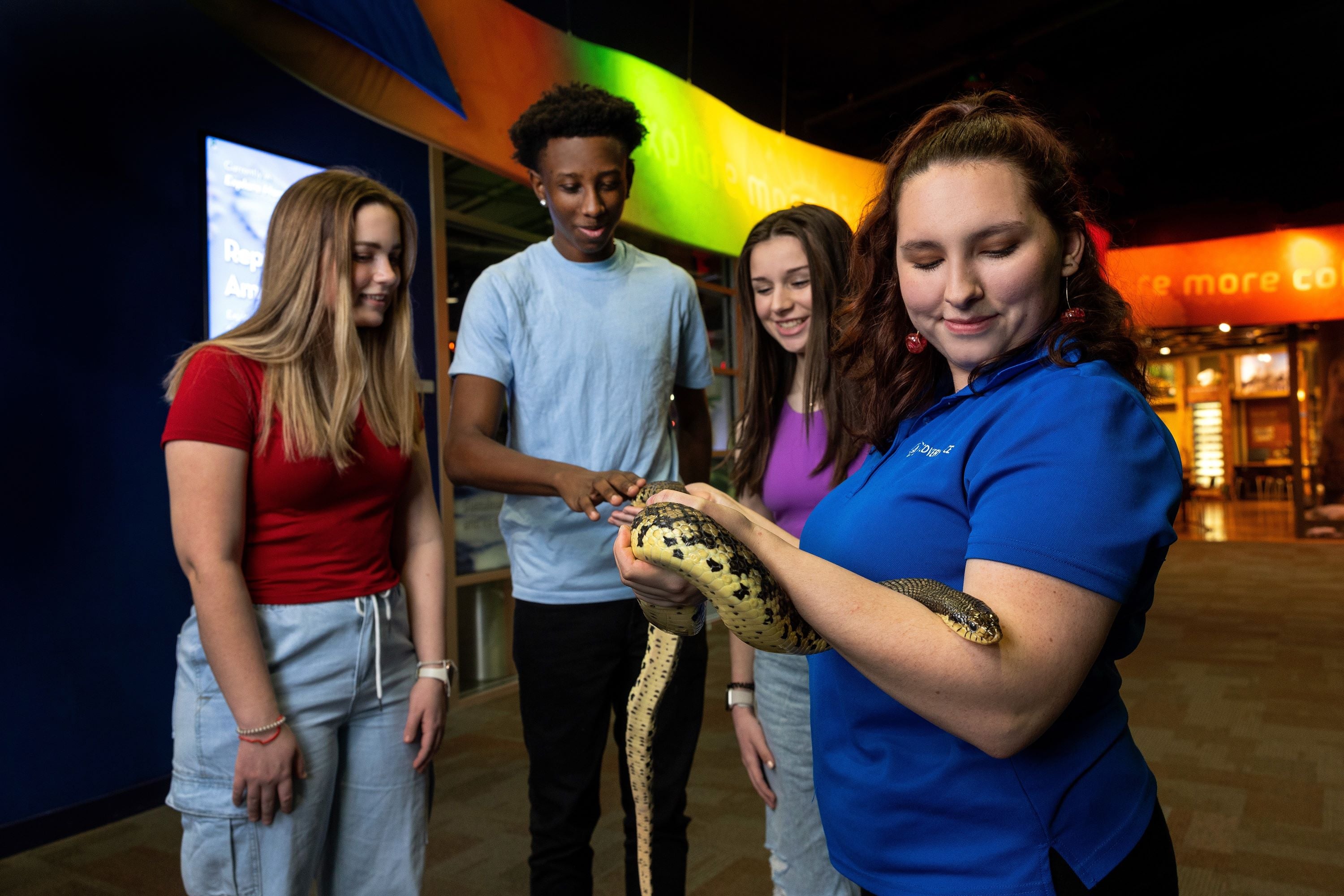All of our animal ambassador contenders reside at Discovery Place Science. Most of them are on display throughout normal museum hours, except for Taz and Cas, who only come out for nose-to-nose encounters. Please note that the animals in our nose-to-nose encounters rotate and occasionally, animals are off display for vet check-ups. If you would like to see a specific one, please call Discovery Place Science at (704) 327-2189 for more information.